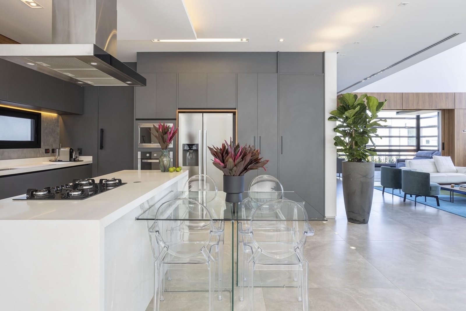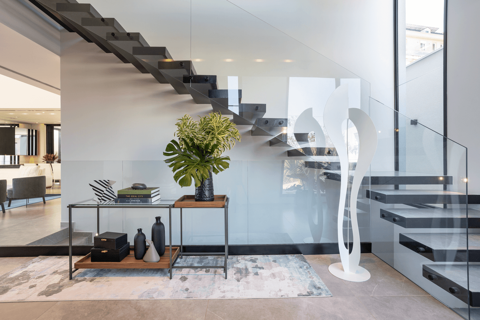 A escada com degrau flutuante logo no hall de entrada da casa, trouxe todo o charme, com o guarda-corpo de vidro embutido que fez toda diferença. Um living totalmente integrado, com pé direito duplo, um lavabo de tirar o fôlego, todo diferente com um papel de parede glamouroso que imita a pele da zebra.