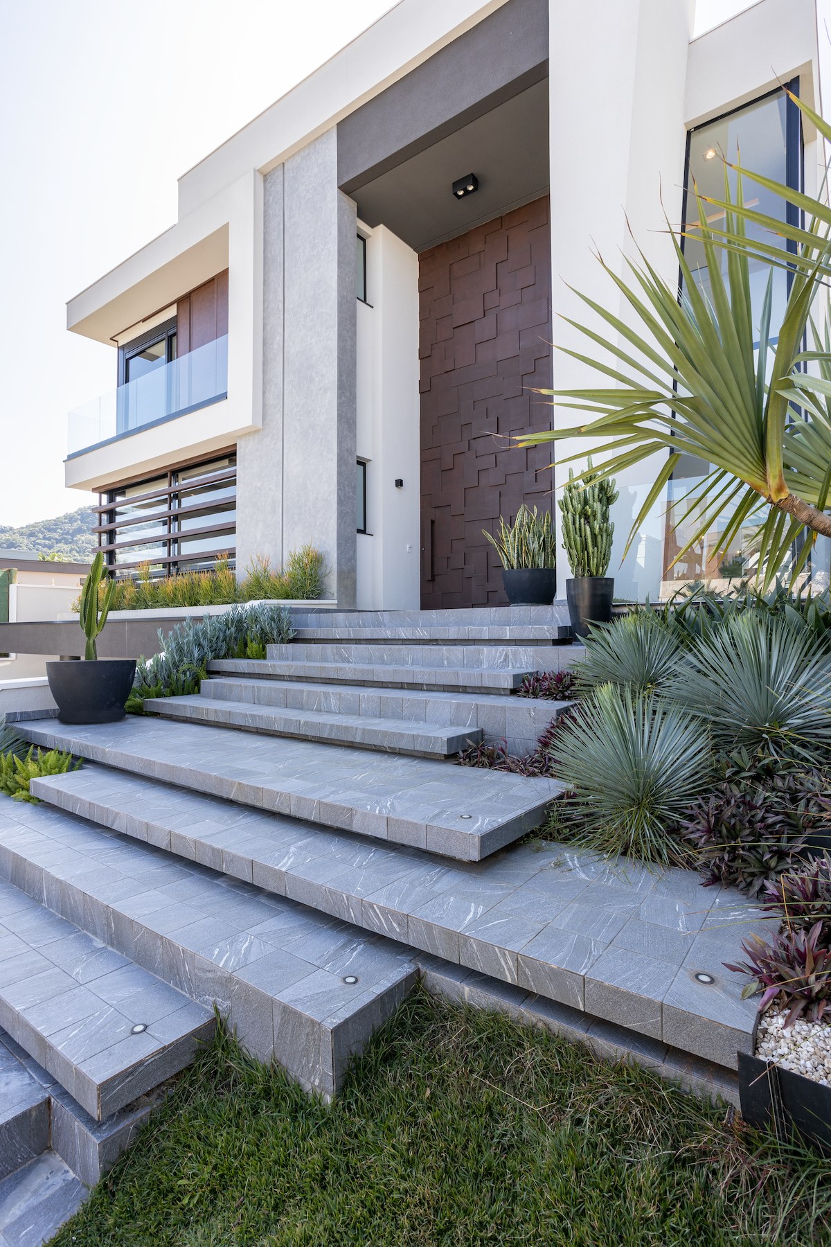 Um diferencial é a porta de entrada (principal) que foi desenhada pelo próprio cliente cliente (demais né?). A casa foi projetada para um casal com dois filhos pequenos, uma área de lazer bem aproveitada, com um paisagismo de cactos e um balanço suspenso para os dias de descanso em família.